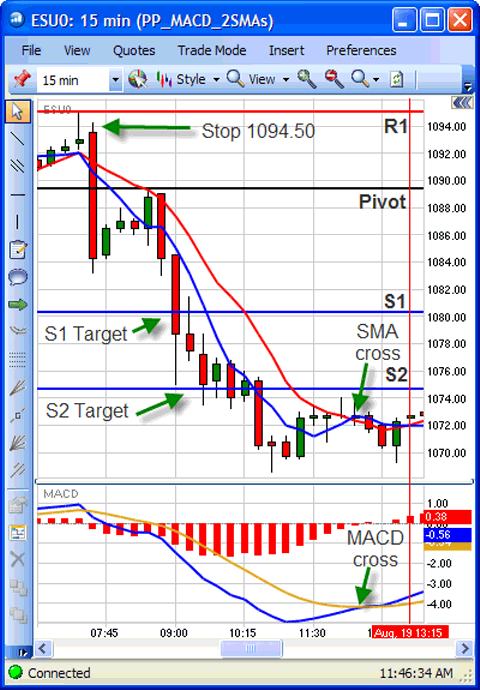 Below is a 15 minute chart for the September 2010 Emini S&P 500. R1 is 1095.00, PP is 1089.50, S1 is 1080.50 and S2 is 1074.75. We have a 5 period SMA and a 10 period SMA with a standard MACD.